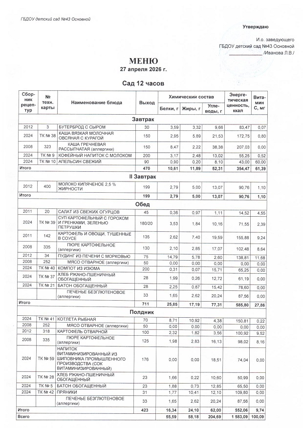 В ежедневном меню указывается наименование блюда и объем порции, а также замены блюд для детей c аллергическими заболеваниями и оксалурией.